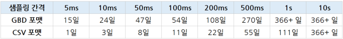 샘플링 간격이 100ms 이하인 경우 데이터 캡처 중에 SD 카드를 교체할 수 있습니다.