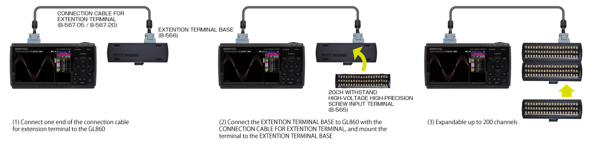 [ 연장 터미널용 연결 케이블(50cm / 2m)을 사용하여 입력 터미널과 GL860을 연장할 수 있습니다. ]