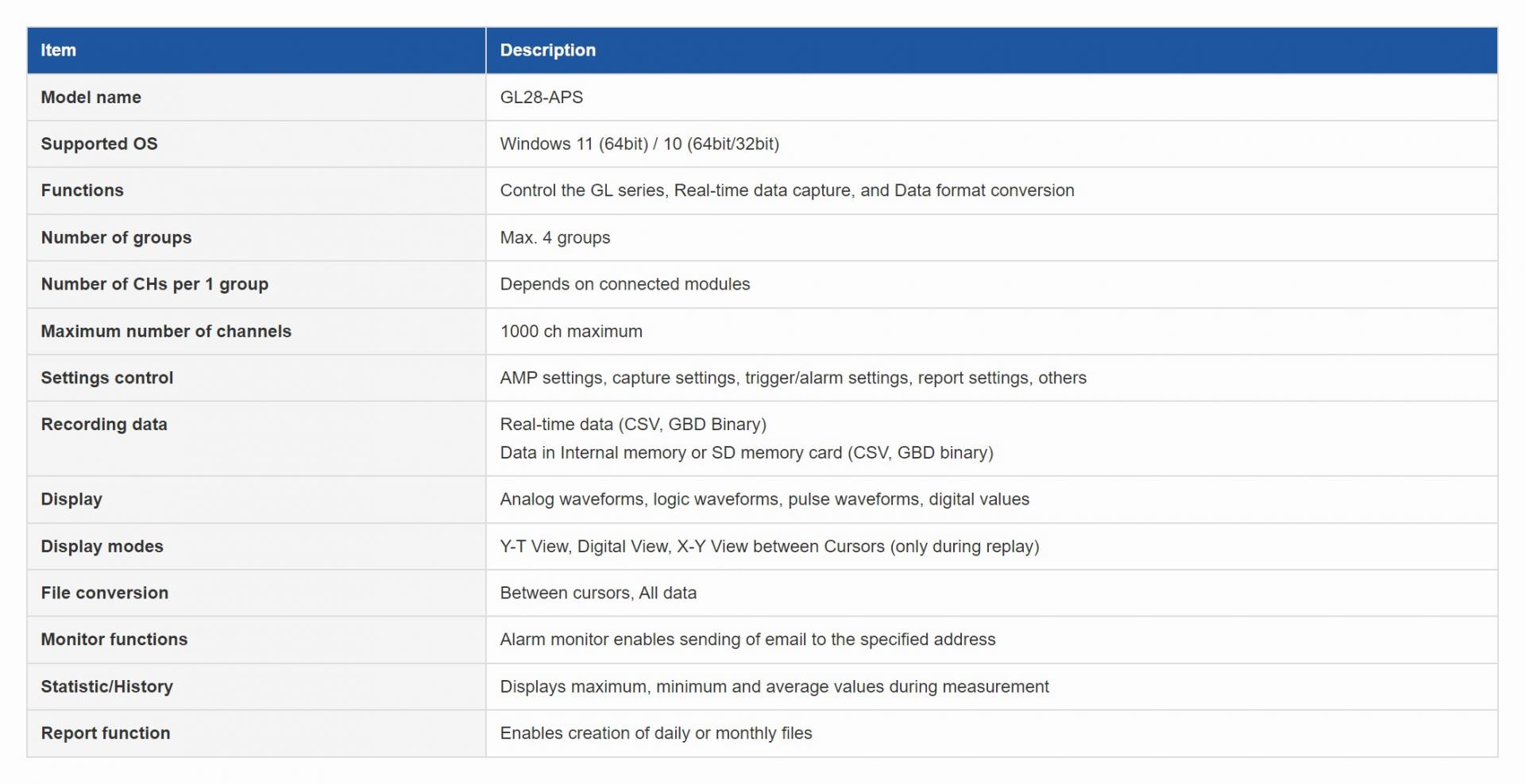 애플리케이션 소프트웨어는 GL 시리즈를 PC에 연결합니다. 캡처한 데이터의 설정, 기록 및 관리를 수행합니다.