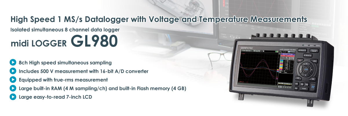 GL980은 고전압 절연 8채널 데이터로거로, 500V 범위, RMS 측정 기능, 모든 채널이 동시에 1MS/s로 절연되고 고속 샘플링을 지원합니다. 기계 성능 및 내구성 테스트에 사용할 수 있습니다.