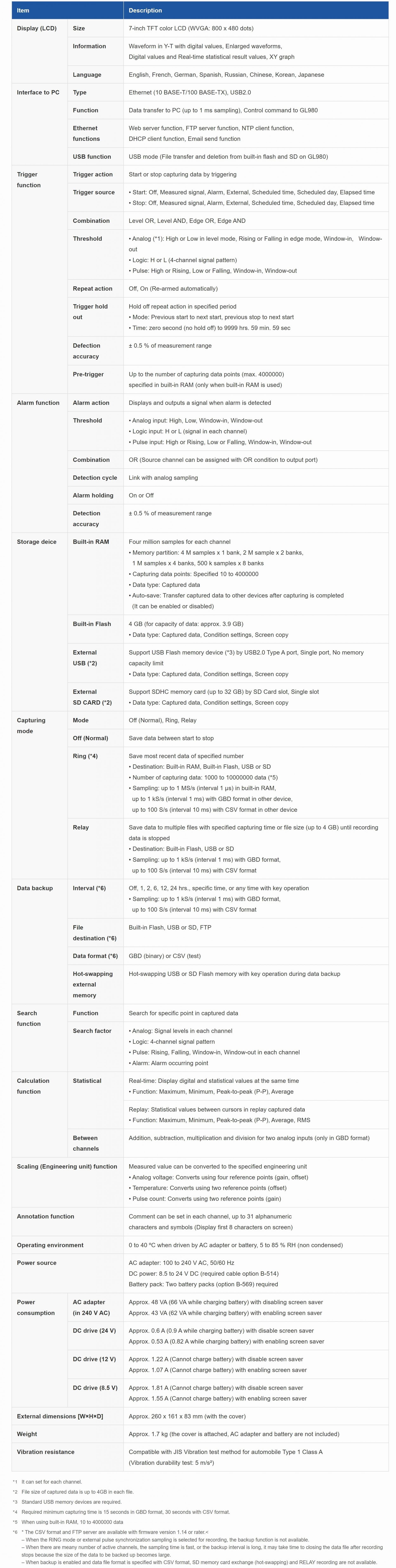 GL980에는 다른 채널의 노이즈로 인한 간섭으로부터 신호를 보호하기 위해 절연 입력 메커니즘이 장착되어 있습니다. 고속 및 고해상도 측정을 위해 16비트 A/D 컨버터를 사용했습니다.