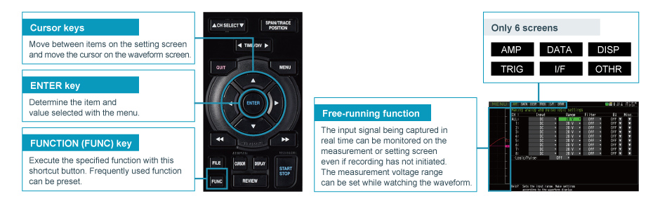 커서 및 엔터 키를 사용한 간단한 조작과 사전 설정된 6개의 메뉴 화면으로 메뉴 중심 조작이 가능합니다: AMP, DATA, DISP, TRIG, I/F(인터페이스) 및 기타.